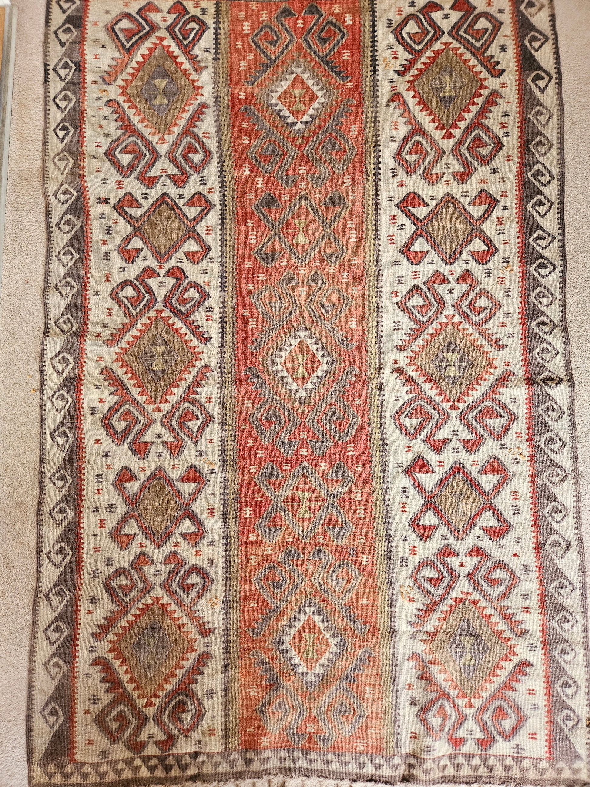 An accent size Kilim with large tribal motifs. Burnt orange on off white ground.