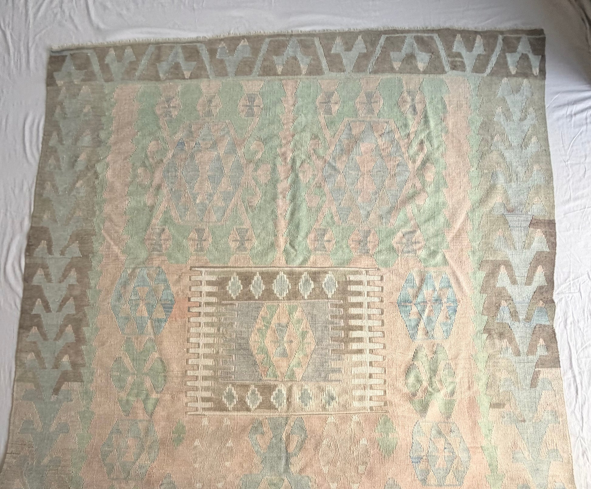 Please note the kilim has undergone some repair here and there. There are small imperfections which can be expected for a Kilim of this age.