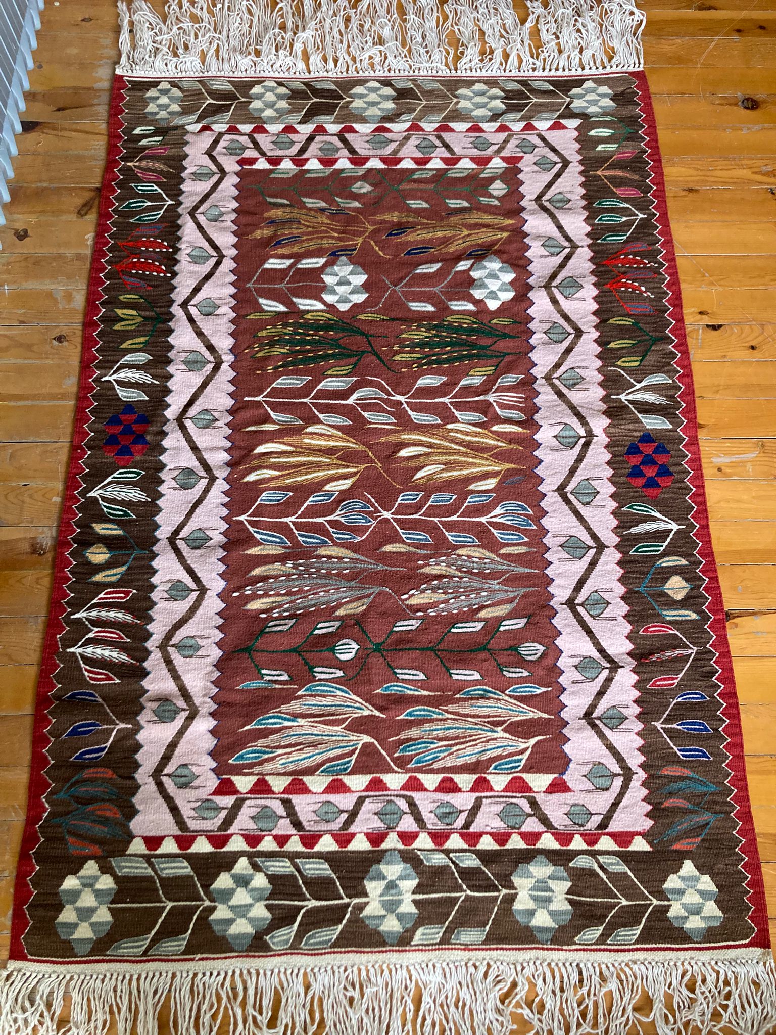 In love with these colours, gorgeous maroon, brown and pinks. This is a finely woven wool kilim.