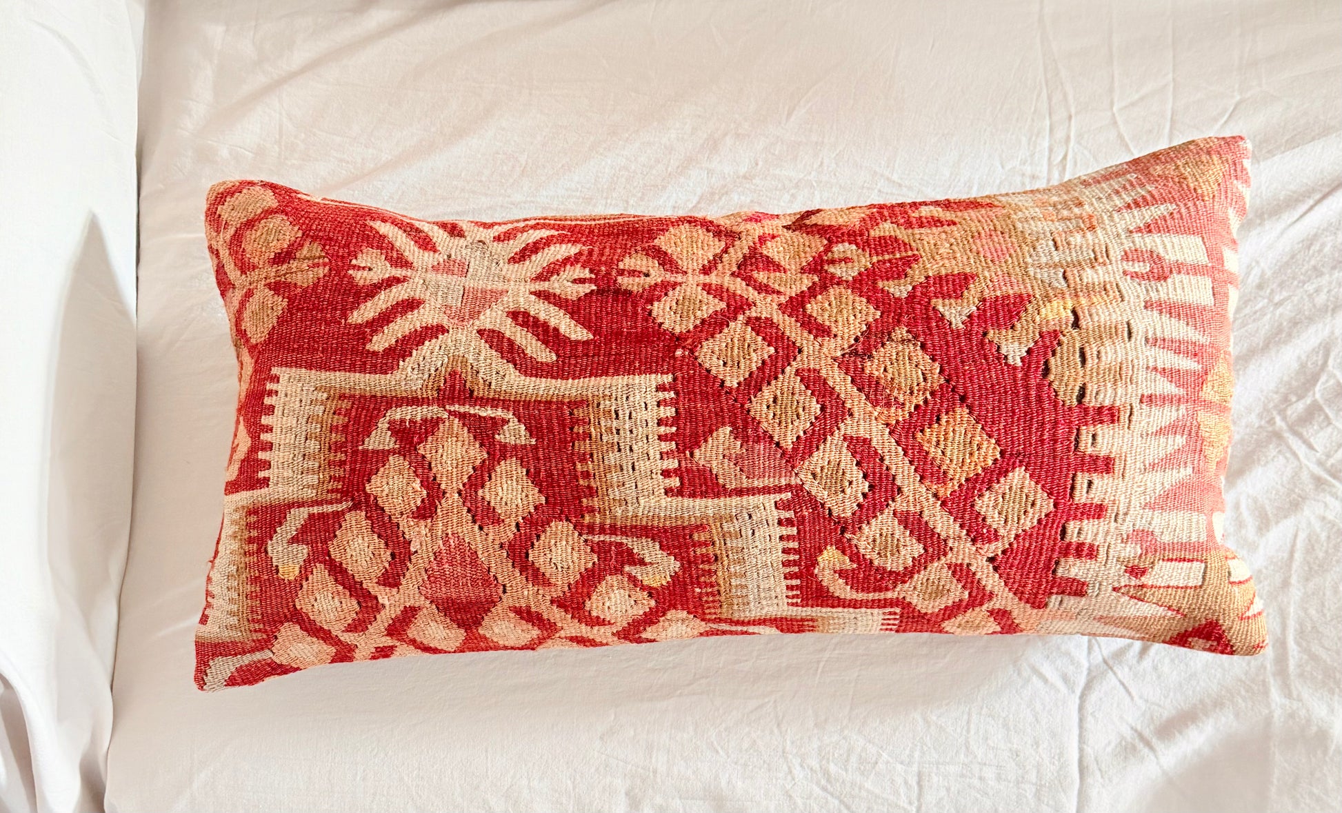 A red tribal lumbar cushion. Repurposed from a 1970s Turkish kilim.